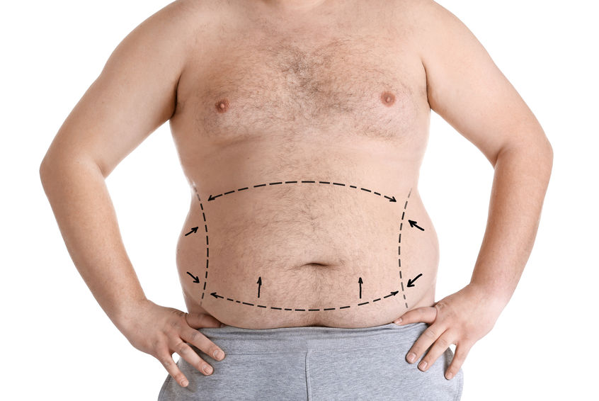 Weight loss concept. Man with marked fat problem areas on body, white background